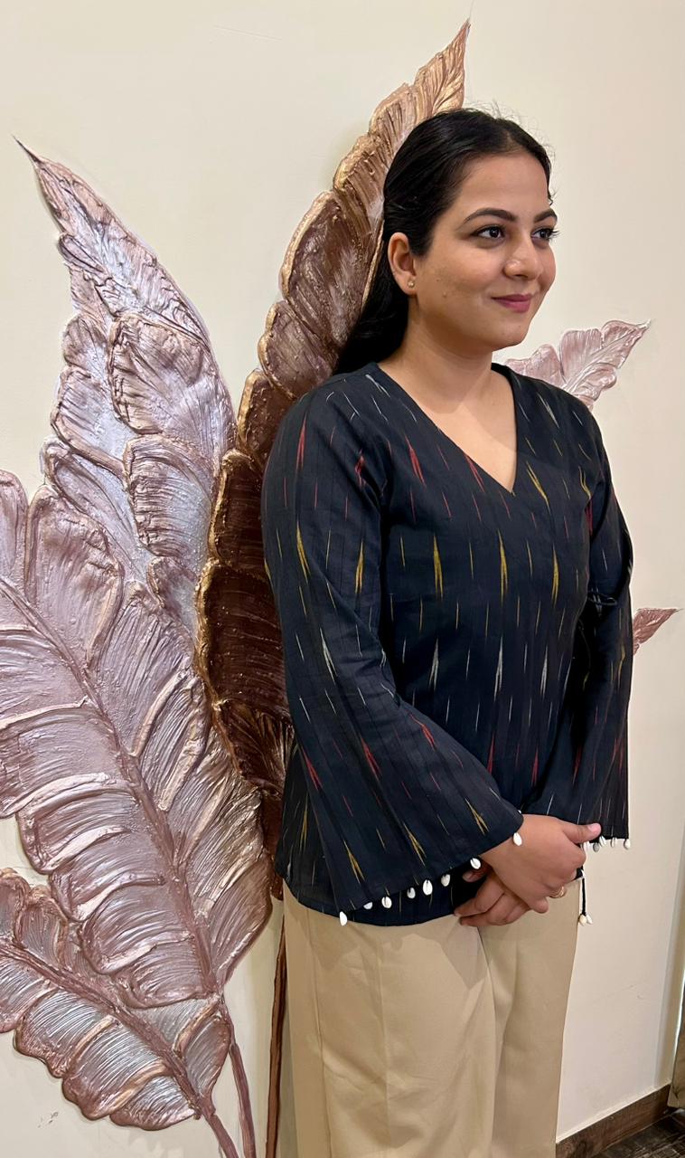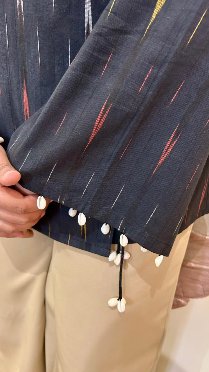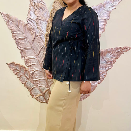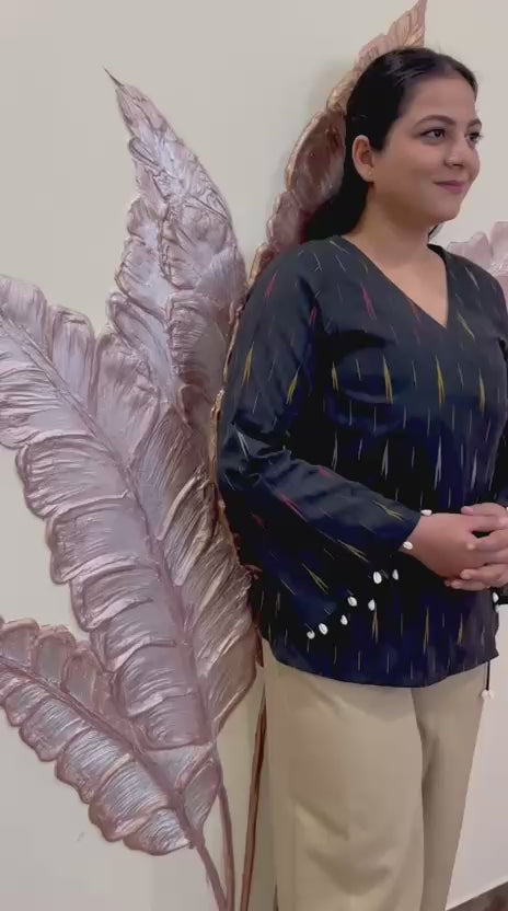 - Styling: Pairs effortlessly with neutral bottoms (as shown), or with straight-cut white pants or jeans to highlight the vibrant Ikat pattern.
